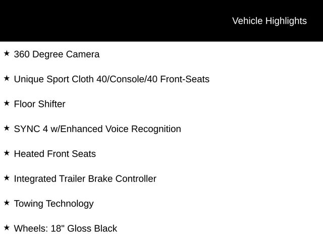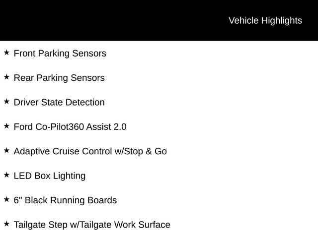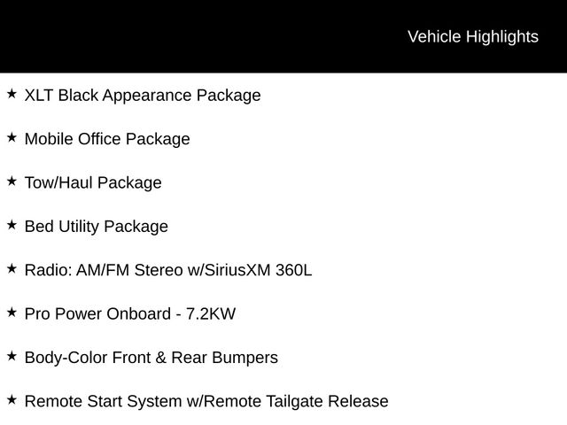 XLT, 4x4, XLT Black Appearance Package, 3.5L PowerBoost Full-Hybrid V6, Adaptive Cruise Control w/Stop & Go, Bed Utility Package, Mobile Office Package, Tow/Haul Package, Towing Technology, 360 Degree Camera, 6" Black Running Boards, Body-Color Front & Rear Bumpers, Driver State Detection, Electronic Locking w/3.73 Axle Ratio, Floor Shifter, Ford Co-Pilot360 Assist 2.0, Front Parking Sensors, Heated Front Seats, Integrated Trailer Brake Controller, LED Box Lighting, Pro Power Onboard - 7.2KW, AM/FM Stereo w/SiriusXM 360L, Rear Parking Sensors, Remote Start System w/Remote Tailgate Release, Tailgate Step w/Tailgate Work Surface, Unique Sport Cloth 40/Console/40 Front-Seats, Wheels: 18" Gloss Black.