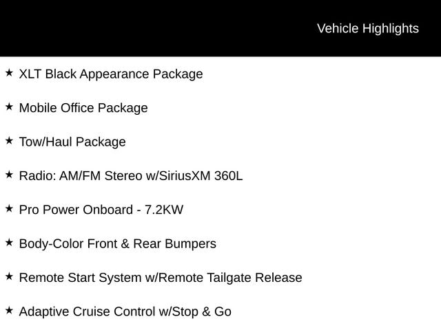 XLT, 4x4, Black Appearance Package, 3.5L PowerBoost Full-Hybrid V6, Mobile Office Package, Tow/Haul Package, 360 Degree Camera, 6" Black Running Boards, Adaptive Cruise Control w/Stop & Go, Connected Navigation, Console Worksurface, Electronic Locking w/3.73 Axle Ratio, Front & Rear Molded Splash Guards, Heated Front Seats, Integrated Trailer Brake Controller, Pro Power Onboard - 7.2KW, AM/FM Stereo w/SiriusXM 360L, Remote Start System w/Remote Tailgate Release, Unique Sport Cloth 40/Console/40 Front-Seats, Body-Color Front & Rear Bumpers, Wheels: 18" Gloss Black, Wireless Charging.