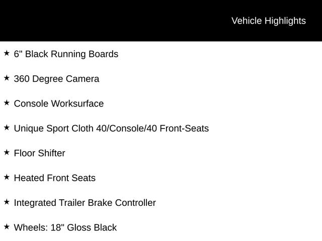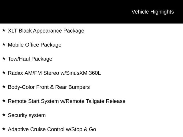 XLT, 4x4, XLT Black Appearance Package, Mobile Office Package, Tow/Haul Package, 360 Degree Camera, 6" Black Running Boards, Adaptive Cruise Control w/Stop & Go, Body-Color Front & Rear Bumpers, Console Worksurface, Electronic Locking w/3.55 Axle Ratio, Floor Shifter, Heated Front Seats, Integrated Trailer Brake Controller, Power-Sliding Rear Window, AM/FM Stereo w/SiriusXM 360L, Remote Start System w/Remote Tailgate Release, Security system, Unique Sport Cloth 40/Console/40 Front-Seats, Wheels: 18" Gloss Black.