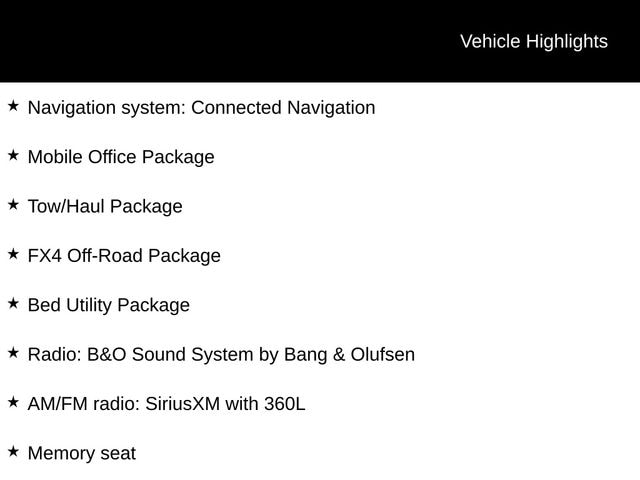Lariat, 4x4, Mobile Office Package, FX4 Off-Road Package, Navigation system: Connected Navigation, Tow/Haul Package, Bed Utility Package, 6" Angular Bright Anodized Step Bar, Console Worksurface, Cooled Seats, Electronic Locking w/3.55 Axle Ratio, Heated front seats, Heated steering wheel, Integrated Trailer Brake Controller, LED Box Lighting, Memory seat, Power driver & Passenger seat, Power Tailgate, B&O Sound System by Bang & Olufsen, SecuriCode Keyless-Entry Keypad, AM/FM radio: SiriusXM with 360L, Wheels: 20" Chrome-Like PVD, Wireless Charging.