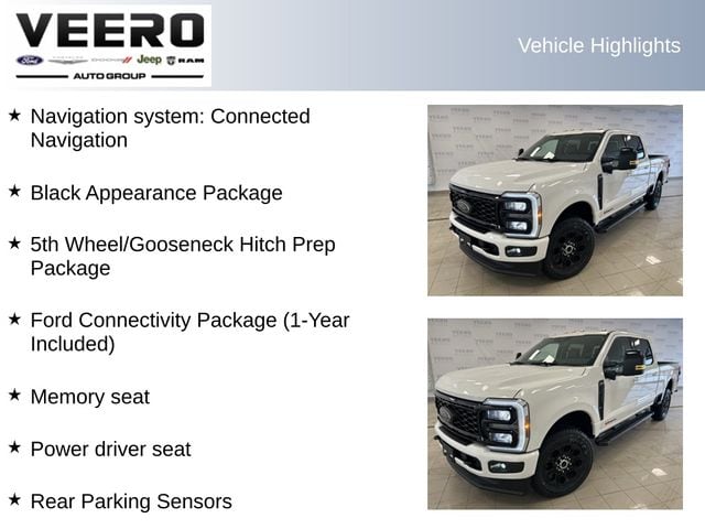5th Wheel/Gooseneck Hitch Prep Package, 6" Ebony Black Angular Running Boards, Black Appearance Package, Cooled Seats, Ford Connectivity Package (1-Year Included), Heated front seats, Heated rear seats, Heated steering wheel, LED Roof Clearance Lights, Memory seat, Navigation system: Connected Navigation, Power driver seat, Power passenger seat, Privacy Glass, Rear Parking Sensors, Wheels: 20" Ebony Black High Gloss.