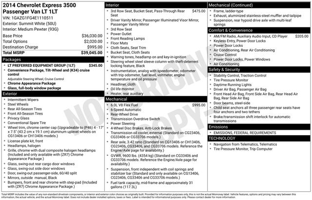 Veero Ford & CDJR of Morris is delighted to offer this stunning 2014 Chevrolet Express 3500 LT in Summit White, beautifully equipped with Chrome Appearance Package (Chrome Grille, Dual Composite Halogen Headlamps, and Front & Rear Chrome Bumpers w/Step-Pad), Convenience Package (Cruise Control and Tilt Steering Wheel), Preferred Equipment Group 1LT (145 Amp Alternator, 8-Point Digital Compass, Custom Cloth Seat Trim, Deluxe Console, Driver & Front Passenger Padded Visors, Full-Floor Color-Keyed Carpeting, Rear Air, Rear Auxiliary Heater, Reclining Front Bucket Seats w/Inboard Armrests, Remote Keyless Entry, and Wheel Trim w/Chrome Center Caps), 12-Passenger Seating (2-3-3-4 Seating Config), 15-Passenger Seating (2-3-3-3-4 Seating Config), 16" x 6.5" Steel Wheels, 2 Speakers, 3.42 Rear Axle Ratio, 3rd row seats: bench, 4-Wheel Disc Brakes, 4th-Row Bench Seat, ABS brakes, Air Conditioning, AM/FM radio, AM/FM Stereo w/Seek & Scan, Compass, Delay-off headlights, Driver door bin, Driver vanity mirror, Driver's Seat Mounted Armrest, Dual front impact airbags, Electronic Stability Control, Emergency communication system, Front anti-roll bar, Front Bucket Seats, Front reading lights, Front wheel independent suspension, Fully automatic headlights, Low tire pressure warning, Overhead airbag, Passenger cancellable airbag, Passenger door bin, Passenger seat mounted armrest, Passenger vanity mirror, Power steering, Power windows, Reading Lights, Rear air conditioning, Rear reading lights, Speed control, Tachometer, Tilt steering wheel, Traction control, Trip computer, Underhood Lights, Variably intermittent wipers, and Voltmeter. Sales Tax, Title, License Fee, Registration Fee, $350 Dealer Documentary Fee, Finance Charges and Emission Testing Fees (if applicable) are additional to the advertised price. Check out the rest of the features on this vehicle. Chrome Appearance Package (Chrome Grille, Dual Composite Halogen Headlamps, and Front & Rear Chrome Bumpers w/Step-Pad), Convenience Package (Cruise Control and Tilt Steering Wheel), Preferred Equipment Group 1LT (145 Amp Alternator, 8-Point Digital Compass, Custom Cloth Seat Trim, Deluxe Console, Driver & Front Passenger Padded Visors, Full-Floor Color-Keyed Carpeting, Rear Air, Rear Auxiliary Heater, Reclining Front Bucket Seats w/Inboard Armrests, Remote Keyless Entry, and Wheel Trim w/Chrome Center Caps), 12-Passenger Seating (2-3-3-4 Seating Config), 15-Passenger Seating (2-3-3-3-4 Seating Config), 16" x 6.5" Steel Wheels, 2 Speakers, 3.42 Rear Axle Ratio, 3rd row seats: bench, 4-Wheel Disc Brakes, 4th-Row Bench Seat, ABS brakes, Air Conditioning, AM/FM radio, AM/FM Stereo w/Seek & Scan, Compass, Delay-off headlights, Driver door bin, Driver vanity mirror, Driver's Seat Mounted Armrest, Dual front impact airbags, Electronic Stability Control, Emergency communication system, Front anti-roll bar, Front Bucket Seats, Front reading lights, Front wheel independent suspension, Fully automatic headlights, Low tire pressure warning, Overhead airbag, Passenger cancellable airbag, Passenger door bin, Passenger seat mounted armrest, Passenger vanity mirror, Power steering, Power windows, Reading Lights, Rear air conditioning, Rear reading lights, Speed control, Tachometer, Tilt steering wheel, Traction control, Trip computer, Underhood Lights, Variably intermittent wipers, and Voltmeter.