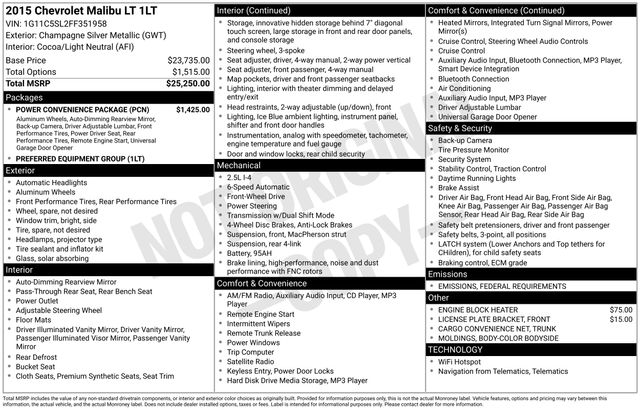 Veero Ford & CDJR of Morris is honored to offer this great-looking 2015 Chevrolet Malibu LT in Champagne Silver Metallic, beautifully equipped with Power Convenience Package (17" 5-Spoke Painted Aluminum Wheels, Body-Color Bodyside Moldings, Driver 8-Way Power Seat Adjuster, Driver Power Lumbar Seat Adjuster, Inside Rear-View Auto-Dimming Mirror, Rear Vision Camera, Remote Vehicle Starter System, Trunk Cargo Convenience Net, and Universal Home Remote), Preferred Equipment Group 1LT, Cocoa/Light Neutral Cloth, 16" Aluminum Wheels, 4-Way Manual Front Passenger Seat Adjuster, 4-Wheel Disc Brakes, 6 Speakers, 7" Diagonal Touch-Screen Color Display, ABS brakes, Air Conditioning, Alloy wheels, AM/FM radio: SiriusXM, AM/FM Stereo w/CD Player & MP3 Playback, Brake assist, Bumpers: body-color, CD player, Chevrolet MyLink, Compass, Delay-off headlights, Driver door bin, Driver vanity mirror, Dual front impact airbags, Dual front side impact airbags, Electronic Stability Control, Emergency communication system: OnStar Directions & Connections, Engine Block Heater, Four wheel independent suspension, Front anti-roll bar, Front Bucket Seats, Front Center Armrest w/Storage, Front License Plate Bracket, Front reading lights, Fully automatic headlights, Heated door mirrors, Illuminated entry, Knee airbag, Low tire pressure warning, Occupant sensing airbag, Outside temperature display, Overhead airbag, Overhead console, Panic alarm, Passenger door bin, Passenger vanity mirror, Power door mirrors, Power driver seat, Power steering, Power windows, Premium Cloth/Leatherette Seat Trim, Radio data system, Rear anti-roll bar, Rear seat center armrest, Rear side impact airbag, Rear window defroster, Remote Keyless Entry, Security system, SiriusXM Satellite Radio, Speed control, Split folding rear seat, Steering wheel mounted audio controls, Tachometer, Telescoping steering wheel, Tilt steering wheel, Traction control, Trip computer, Turn signal indicator mirrors, and Variably intermittent wipers. Sales Tax, Title, License Fee, Registration Fee, $350 Dealer Documentary Fee, Finance Charges and Emission Testing Fees (if applicable) are additional to the advertised price. Check out the rest of the features on this vehicle. Power Convenience Package (17" 5-Spoke Painted Aluminum Wheels, Body-Color Bodyside Moldings, Driver 8-Way Power Seat Adjuster, Driver Power Lumbar Seat Adjuster, Inside Rear-View Auto-Dimming Mirror, Rear Vision Camera, Remote Vehicle Starter System, Trunk Cargo Convenience Net, and Universal Home Remote), Preferred Equipment Group 1LT, Cocoa/Light Neutral Cloth, 16" Aluminum Wheels, 4-Way Manual Front Passenger Seat Adjuster, 4-Wheel Disc Brakes, 6 Speakers, 7" Diagonal Touch-Screen Color Display, ABS brakes, Air Conditioning, Alloy wheels, AM/FM radio: SiriusXM, AM/FM Stereo w/CD Player & MP3 Playback, Brake assist, Bumpers: body-color, CD player, Chevrolet MyLink, Compass, Delay-off headlights, Driver door bin, Driver vanity mirror, Dual front impact airbags, Dual front side impact airbags, Electronic Stability Control, Emergency communication system: OnStar Directions & Connections, Engine Block Heater, Four wheel independent suspension, Front anti-roll bar, Front Bucket Seats, Front Center Armrest w/Storage, Front License Plate Bracket, Front reading lights, Fully automatic headlights, Heated door mirrors, Illuminated entry, Knee airbag, Low tire pressure warning, Occupant sensing airbag, Outside temperature display, Overhead airbag, Overhead console, Panic alarm, Passenger door bin, Passenger vanity mirror, Power door mirrors, Power driver seat, Power steering, Power windows, Premium Cloth/Leatherette Seat Trim, Radio data system, Rear anti-roll bar, Rear seat center armrest, Rear side impact airbag, Rear window defroster, Remote Keyless Entry, Security system, SiriusXM Satellite Radio,