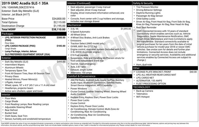 Veero Ford & CDJR of Morris is very proud to offer this wonderful-looking 2019 GMC Acadia SLE-1 in Dark Sky Metallic, beautifully equipped with Cargo Package (LPO) (Retractable Cargo Shade and Vertical Cargo Net (LPO)), Interior Protection Package (LPO) (1st & 2nd Row All Weather Floor Mats (LPO), 3rd Row All Weather Floor Mats (LPO), and All Weather Cargo Mat (LPO)), Preferred Equipment Group 3SA, AWD, Black Cloth, 155 Amp Alternator, 17" x 7.5" Aluminum Wheels, 3rd Row Seating, 4-Wheel Disc Brakes, 6 Speakers, 6-Speaker Audio System Feature, 7-Passenger (2-3-2 Seating Configuration), ABS brakes, Air Conditioning, Alloy wheels, AM/FM radio: SiriusXM, Apple CarPlay/Android Auto, Automatic temperature control, Brake assist, Bumpers: body-color, Compass, Delay-off headlights, Driver door bin, Driver vanity mirror, Dual front impact airbags, Dual front side impact airbags, Electronic Stability Control, Emergency communication system: OnStar and GMC connected services capable, Exterior Parking Camera Rear, Four wheel independent suspension, Front anti-roll bar, Front Bucket Seats, Front Center Armrest, Front dual zone A/C, Front License Plate Bracket, Front reading lights, Fully automatic headlights, Heated door mirrors, Illuminated entry, Knee airbag, Low tire pressure warning, Occupant sensing airbag, Outside temperature display, Overhead airbag, Overhead console, Panic alarm, Passenger door bin, Passenger vanity mirror, Power door mirrors, Power steering, Power windows, Premium audio system: GMC Infotainment System, Premium Cloth Seat Trim, Radio data system, Radio: AM/FM w/7" Diagonal Color Touch Screen, Rear air conditioning, Rear anti-roll bar, Rear reading lights, Rear seat center armrest, Rear window defroster, Rear window wiper, Remote Keyless Entry, Security system, SiriusXM Radio, Speed control, Speed-sensing steering, Split folding rear seat, Spoiler, Steering wheel mounted audio controls, Stop-Start Engine Control System, Tachometer, Telescoping steering wheel, Tilt steering wheel, Traction control, Trip computer, Variably intermittent wipers, and Voltmeter. Sales Tax, Title, License Fee, Registration Fee, $350 Dealer Documentary Fee, Finance Charges and Emission Testing Fees (if applicable) are additional to the advertised price. Check out the rest of the features on this vehicle. Cargo Package (LPO) (Retractable Cargo Shade and Vertical Cargo Net (LPO)), Interior Protection Package (LPO) (1st & 2nd Row All Weather Floor Mats (LPO), 3rd Row All Weather Floor Mats (LPO), and All Weather Cargo Mat (LPO)), Preferred Equipment Group 3SA, AWD, Black Cloth, 155 Amp Alternator, 17" x 7.5" Aluminum Wheels, 3rd Row Seating, 4-Wheel Disc Brakes, 6 Speakers, 6-Speaker Audio System Feature, 7-Passenger (2-3-2 Seating Configuration), ABS brakes, Air Conditioning, Alloy wheels, AM/FM radio: SiriusXM, Apple CarPlay/Android Auto, Automatic temperature control, Brake assist, Bumpers: body-color, Compass, Delay-off headlights, Driver door bin, Driver vanity mirror, Dual front impact airbags, Dual front side impact airbags, Electronic Stability Control, Emergency communication system: OnStar and GMC connected services capable, Exterior Parking Camera Rear, Four wheel independent suspension, Front anti-roll bar, Front Bucket Seats, Front Center Armrest, Front dual zone A/C, Front License Plate Bracket, Front reading lights, Fully automatic headlights, Heated door mirrors, Illuminated entry, Knee airbag, Low tire pressure warning, Occupant sensing airbag, Outside temperature display, Overhead airbag, Overhead console, Panic alarm, Passenger door bin, Passenger vanity mirror, Power door mirrors, Power steering, Power windows, Premium audio system: GMC Infotainment System, Premium Cloth Seat Trim, Radio data system, Radio: AM/FM w/7" Diagonal Color Touch Screen, Rear air conditioning, Rear anti-roll bar, Rear reading lights, Rear seat center armrest, Rear window defroster, Rear window wiper