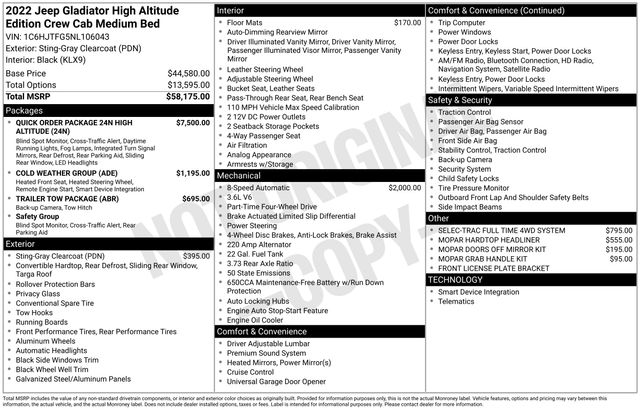 Veero Ford & CDJR of Morris is honored to offer this attractive-looking 2022 Jeep Gladiator High Altitude in Sting-Gray Clearcoat, beautifully equipped with Cold Weather Group (Heated Front Seats and Heated Steering Wheel), High Altitude Package, LED Lighting Group (Daytime Running Lamps LED Accents, Front LED Fog Lamps, LED Park Turn Lamps, LED Premium Reflector Headlamps, and LED Taillamps), Quick Order Package 24N High Altitude (110 MPH Vehicle Max Speed Calibration, Body Color 3-Piece Hard Top, Body Color Front Bumper, Body Color Grille w/Gloss Black Rings, Body Color Rear Bumper w/Step Pads, Body-Color Door & Tailgate Handles, Bridgestone Brand Tires, Caramel Interior Accents, Dana M210 Wide Front Axle, Dana M220 Wide Rear Axle, Exterior Mirrors w/Supplemental Signals, Freedom Panel Storage Bag, Full Body Color Fender Flares, Full Length Floor Console Premium Armrest, Gray/Black Trail Rated Badge, Jeep Badge, Leather Wrapped Park Brake Handle, Leather Wrapped Shift Knob, Leather-Trimmed Bucket Seats, No Soft Top, Premium Dark Exterior Accents, Rear Armrest w/Cupholder Seat, Rear Sliding Window, Rear Window Defroster, Sport Front Shock Absorbers, Sport Rear Shock Absorbers, Sport Suspension, Wheels: 20" x 8" Gloss Black Aluminum, and Wrapped I/P Bezel w/Caramel Stitch), Safety Group (Blind Spot & Cross Path Detection and ParkSense Rear Park Assist System), Trailer Tow Package (240 Amp Alternator, Class IV Receiver Hitch, Heavy-Duty Engine Cooling, and Trailer Hitch Zoom), 3.73 Rear Axle Ratio, 4-Wheel Disc Brakes, 9 Speakers, ABS brakes, Air Conditioning, Alloy wheels, AM/FM radio: SiriusXM, Apple CarPlay/Android Auto, Auto-dimming Rear-View mirror, Automatic temperature control, Brake assist, Compass, Delay-off headlights, Driver door bin, Driver vanity mirror, Dual front impact airbags, Dual front side impact airbags, Electronic Stability Control, Emergency communication system: SiriusXM Guardian, Front anti-roll bar, Front Bucket Seats, Front Center Armrest w/Storage, Front dual zone A/C, Front fog lights, Front License Plate Bracket, Front reading lights, Fully automatic headlights, Garage door transmitter, Heated door mirrors, Illuminated entry, Integrated roll-over protection, Leather steering wheel, Low tire pressure warning, MOPAR All-Weather Slush Mats, MOPAR Doors Off Mirror Kit, MOPAR Grab Handle Kit, MOPAR Hardtop Headliner, Navigation System, Normal Duty Plus Suspension, Occupant sensing airbag, Outside temperature display, Overland Cloth Bucket Seats, Panic alarm, ParkView Rear Back-Up Camera, Passenger door bin, Passenger vanity mirror, Power door mirrors, Power steering, Power windows, Radio data system, Radio: Uconnect 4C Nav w/8.4" Display, Rear anti-roll bar, Rear reading lights, Remote Keyless Entry, Remote Start System, Security system, Selec-Trac Full Time 4WD System, Speed control, Split folding rear seat, Steering wheel mounted audio controls, Tachometer, Telescoping steering wheel, Tilt steering wheel, Traction control, Trip computer, Variably intermittent wipers, Voltmeter, and Wheels: 18" x 7.5" Granite Crystal Aluminum. Sales Tax, Title, License Fee, Registration Fee, $350 Dealer Documentary Fee, Finance Charges and Emission Testing Fees (if applicable) are additional to the advertised price. Check out the rest of the features on this vehicle. Cold Weather Group (Heated Front Seats and Heated Steering Wheel), High Altitude Package, LED Lighting Group (Daytime Running Lamps LED Accents, Front LED Fog Lamps, LED Park Turn Lamps, LED Premium Reflector Headlamps, and LED Taillamps), Quick Order Package 24N High Altitude (110 MPH Vehicle Max Speed Calibration, Body Color 3-Piece Hard Top, Body Color Front Bumper, Body Color Grille w/Gloss Black Rings, Body Color Rear Bumper w/Step Pads, Body-Color Door & Tailgate Handles, Bridgestone Brand Tires, Caramel Interior Accents, Dana M210 Wide Front Axle, Dana M220 Wide Rear Axle, Exterior Mirrors w/Supplemental Signals, Freedom Panel Storage Bag, Full Body