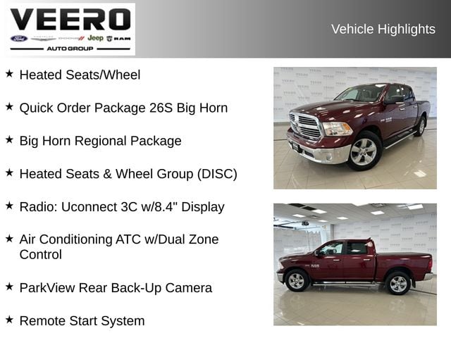 **Big Horn**Crew Cab**Remote Start**Heated Cloth Front Bucket Seats**Heated Steering Wheel**Front Dual Zone A/C**Parksense Front/Rear Park Assist System, Power-Heated Fold-Away Mirrors, Power Driver Seat, Class IV Receiver Hitch, Backup Camera, LED Bed Lighting, ParkSense Front/Rear Park Assist System, Radio: Uconnect 3C w/8.4" Display, Universal Garage Door Opener, Wheels: 20" x 8" Aluminum Chrome Clad.